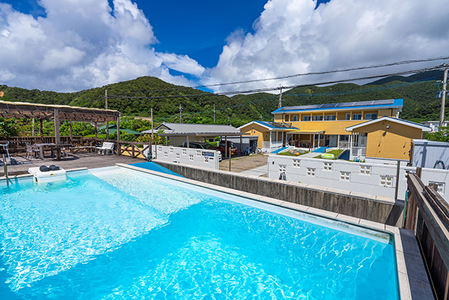 長さ9m、最大水深2.5mのプールは、車いすに座ったままエントリーが可能なスロープ付き。ダイビングやシュノーケリングは、海に行く前に練習できるかどうかで、リスクや快適度が大きく変わります。施設の目の前に併設されていて、遊ぶのはもちろんOK。夜はプールがライトアップし、ラグジュアリーな空間をお楽しみいただけます。